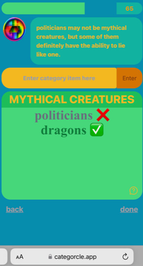 (Screenshot from Categorcle, a toy app that uses GPT behind the scenes to train word-finding ability in aphasia patients, and creativity in everyone else!)